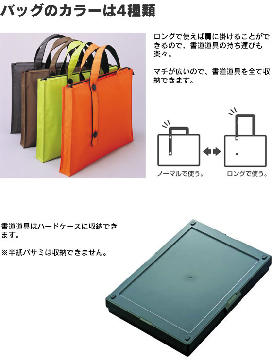 商品詳細 バッグサイズ 300×400×80mm セット内容 ・収納バッグ 4色(橙/黄緑/茶/黒) ・太筆「4号間中至楽」 ・細筆「菖蒲」 ・固形墨「仁印呉竹」 ・書道用液 書芸呉竹 紫紺 180ml ・筆巻 赤/紺 ・本石天平硯 四五平 ・文鎮「古銭」 ・規格判フェルト下敷き ・水差し ・半紙ハサミ 赤・紺(柄は選べません) 発送日 名入れなし:ご注文後1〜2週間 名入れあり:ご注文後2〜3週間 配送方法 メール便では発送できません □名入れについて□ ・お名前は既存の文字(例:至言 あかしや製など)の裏にお名入れ致します。